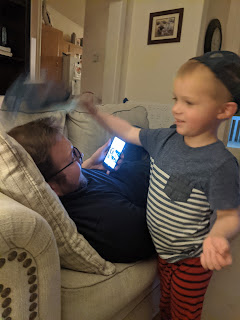 Thursday was Logan's birthday! We had bacon for breakfast and let him eat his heart out. He and I napped that afternoon and it reminded me of our first nap together when we brought him home from the birth center. I'm such a fan of the midwifery model of care: I was home two hours after Logan was born! I reminisced about all the aspects of his birth throughout the day, and day dreamed about my upcoming birth and who is going to be joining our family in June. We had all of Logan's favorite foods for dinner. Then Granny and Gramps came over for present opening and cake. Three year-old Logan is feisty and equally sweet. He will cuddle and give kisses, but watch out because he will also try to poke your eyes out.